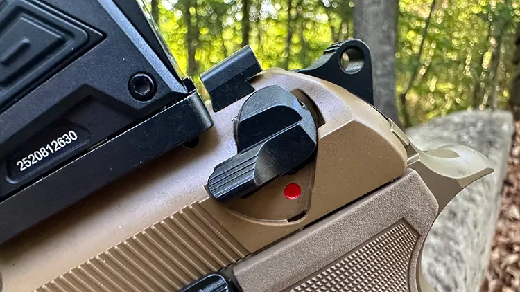 The decocker sits just in front of the hammer and shows the classic "fire" red dot indicating the gun is ready to fire.