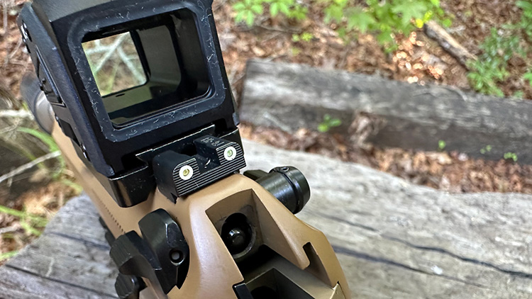 The iron sights don't come close to co-witnessing because they sit almost even with the optic mounting block. Even a smaller pistol red dot sight wouldn't help you achieve a co-witness due to the mounting plate height.